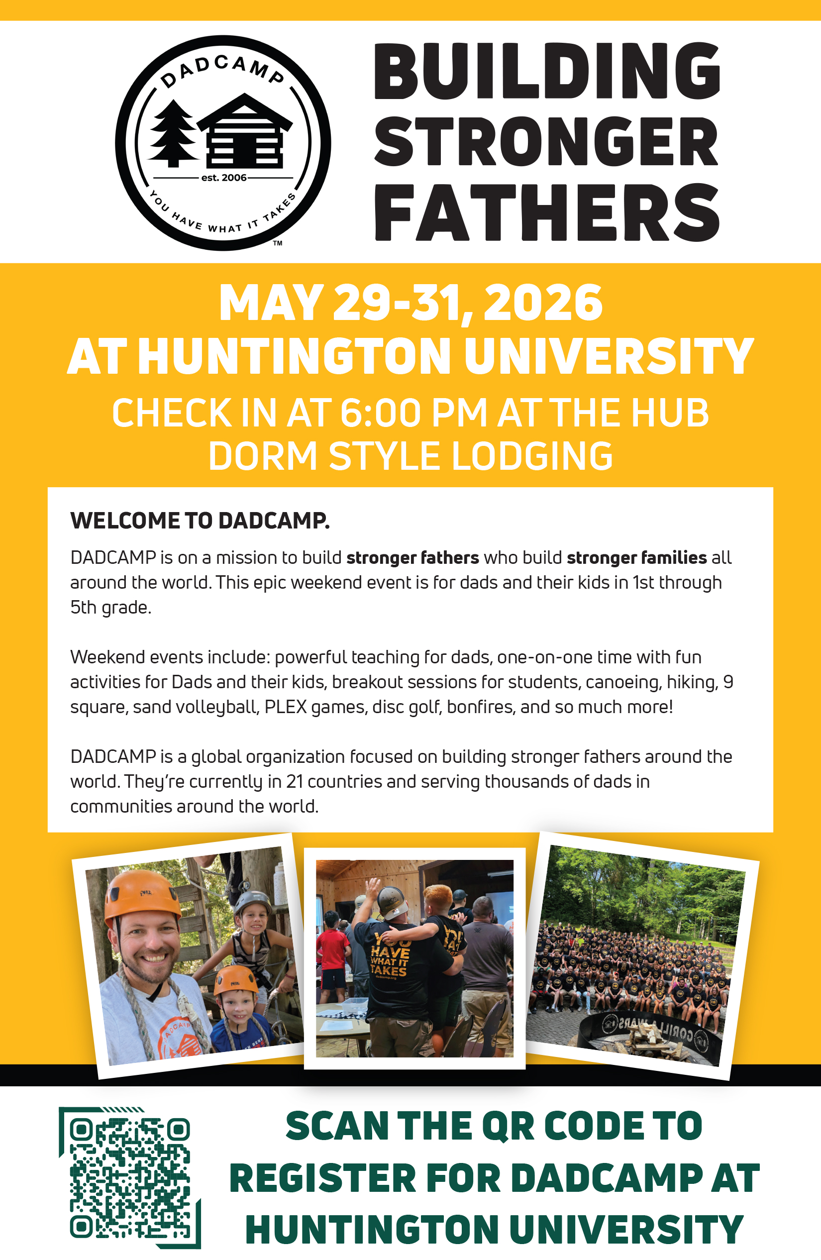 Dads and children (K-5th) are invited to join HU as we team up with our alum, Jason Braun, and DADCAMP. HU is hosting its very first DADCAMP May 29-31. Get registered today, spots are going fast!