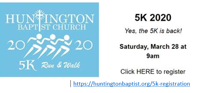 Huntington Baptist Church – 2435 Waterworks Rd – Huntington5K Run & Walk-Saturday, March 28, at 9:00 a.m. Register here – First 50 receive free T-shirt Posted By: Becky Kersey